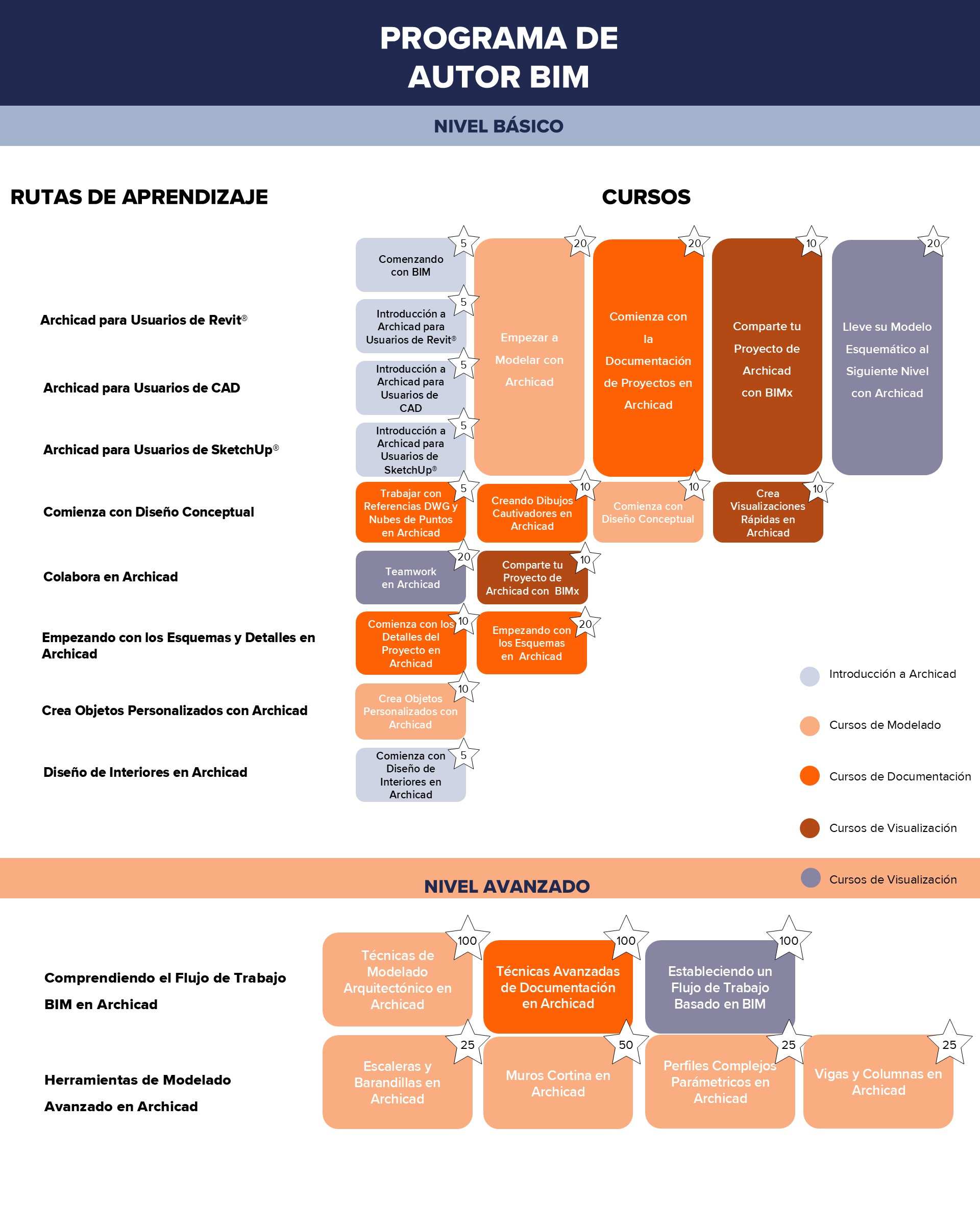 Una vez que adquieras el Programa de Autor BIM tendrás acceso instantáneo a todos los cursos en línea, organizados en las rutas de aprendizaje que se muestran a continuación: